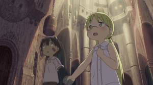 While it is fairly easy to follow, there really is something extremely engaging about the experience. Part of that is the art with Kinema Citrus; it’s a fantastic blend of cutesy character designs and gorgeous, near Ghibli-style backgrounds. But for the most part, the show has a really solid tone and a knack for worldbuilding. There are some really funny moments. I particularly lost it when Reg finds out how thorough Riko’s examination of him was (and I do mean thorough). At the same time, there is a genuinely mythical and ominous air to the Abyss. Not only has no one seen the bottom of the place, but you apparently get increasingly sick and insane the farther you go down (it’s classified as a curse). And let’s not forget the fact that the place is crawling with monsters. And lot of this information is presented via dialogue (sometimes narration) and some gorgeous in-universe drawings and props. It’s diegetic and it also builds up our expectations of what Riko and Reg will face on their adventure. It’s easy to buy Nat’s objections to Riko’s plan because the Abyss really does sound dangerous.