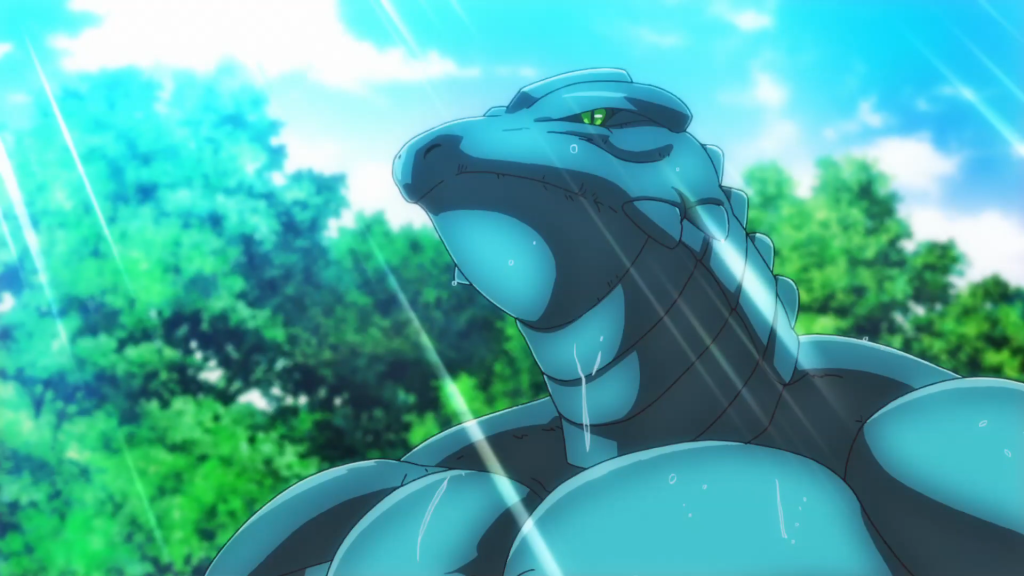 But I don’t think we’ve seen a customer as strange as the lizardman warrior, Gaganpo (Makoto Yasumura). Good Lord, was his vignette something. Not only has Gaganpo’s village built a shrine around a door to Nekoya and send Gaganpo there to get takeout omelette rice, but the whole story is presented like it’s a nature documentary. There’s even a narrator to describe the lizard people’s society, culture, and their weekly omelette rice festival to great detail. Just seeing lizard people goggle over omelette rice was enough but the narration pushes the amusement even further. It might bore some viewers but I thought it was hilarious. I wonder if the Master even knows that these people are worshiping his restaurant. Given his casual attitude to everything, he probably wouldn’t bat an eye though.