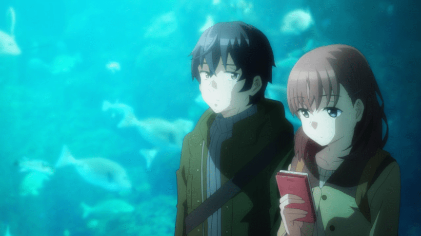 To be straight to the point: I really enjoyed the second episode of Just Because!, perhaps a bit more so than the premiere. Here, we’re presented with Eita’s little reunion with Mio though that event plays out within an even larger one: Haruto’s unsuccessful attempts to confess to Hazuki Morikawa, one of the brass musicians we sat last episode. Actually, that’s somewhat unfair because while Haruto does screw up his first attempt in typical teenage fashion, he does salvage it a bit by setting up a group hangout at the aquarium with Hazuki and a friend of hers invited (and Eita and Mio dragged into it). That plan probably could’ve worked but unfortunately for Haruto, Hazuki gets pressured by her two little brothers to take them to the trip as well.