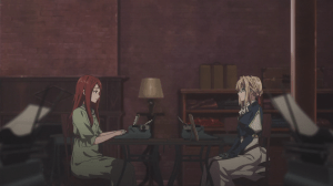 One thing I dislike about Violet Evergarden‘s guest characters is the low chance of seeing them again and that’s certainly true with Luculia. Frankly, I kind of wish she was a mainstay in the cast because I honestly find her more readily interesting than Iris or Erica. Her struggling with a drunk and guilt-ridden brother is nothing unique but it’s an effective parallel to Violet’s own conflict. Similar to how the meaning of love eludes Violet, Luculia wants to express gratitude to her brother for surviving the war but struggles to find the right way to say it. Furthermore, it’s just neat seeing a character befriend and help Violet from the get go. The writers could’ve easily made Luculia a rival for Violet but I’m glad that they took the opposite direction. I really like watching Luculia cheer Violet up when the latter is failing the class and even offer to ghostwrite a letter to Gilbert. The latter scene sadly doesn’t make much progress but the conversation the two characters share together does help put Violet on the right path.