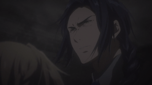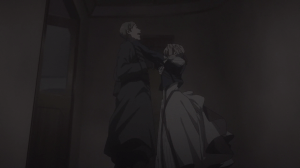 For all its problems though, I am glad that the anime finally offered the long awaited confrontation between Violet and Diethard. The latter is one of the more interesting characters in the story — someone who has seen the worst of Violet, only acknowledges her utility, and has a hard time believing in her humanity. I thought it was a clever bit of juxtaposition to have Diethard save Violet just as the latter was about to lose her life and her brooch. For moment, Violet thinks it was Gilbert though it obviously couldn’t be true. Instead, it’s someone who bears a resemblance to the Major; sharing the same green eyes but lacking the kindness that Violet associates with them.