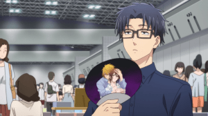 If you recall from the first episode, one big benefit Hirotaka brought up to Narumi about them dating was being able to help her out with her Comiket booth. That was a very silly thing that sold Narumi on the relationship and as far as we can tell, the romance has gone in a pretty genuine direction. Still, Comiket is about to happen and Hirotaka was not kidding when he said he’d help out. Not only did he help Narumi get her doujin done on time, he was even bold enough to help sell the yaoi when his girlfriend was away for a bit. I know there’s better proof that this relationship can work but damn, Hirotaka’s a keeper.