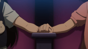 I love that these girls then start talking on the phone. It’s a reminder that the distance is communicative, not literal. And from a directorial standpoint, this scene is just great. It feels normal as Hikari and Karen just talk about all sorts of things — what they’ve being doing, likes, dislikes, theater, and of course, their promise to be stars together. Even more interesting is how abridged the script is. You only hear bits and pieces of their conversation and in out of order no less. It’s initially confusing but it compliments the casual tone the scene is going for. And really, the main takeaway is simply that these two characters are finally talking after silence and one humorous kidnapping. The details don’t matter here.