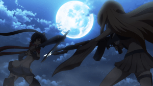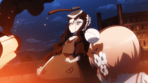 The fight between her and Ripple (later joined by Top Speed) is fun to watch. It is pretty one-sided for most of its duration but then again, Ripple has a sword and some shurikens and Mary has a bunch of guns. Someone clearly has a slight advantage here. I guess Ripple does have that special ability that lets any of her projectiles land but that didn’t seem to help too much since Mary is quite the sharpshooter. Still, the fight animation is pretty good and throwing in Top speed into the fray spiced things up. Not going to lie, seeing Top Speed’s broom producing a motorcycle windshield was kind of badass even if it is silly. Her flying Ripple high up so that the latter can send shards of glass to overwhelm Mary is also a highlight of the fight. What a clever strategy that was.