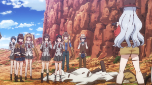 Much like with Nana’s adventure in Love and Lies, it’s the stuff that strictly adheres to the parallel world that’s most entertaining. Sexy Yu arrives to the scene with a carriage pulled by a motorcycle and Asuka impulsively joins the heist against Base Yu’s objections. Chloe and Nana convince Red Dead Asuka that she has the wrong crooks so she makes them assist in an ambush against the actual robbers. Everyone gets arrested and is sentenced by a corrupt judge to duel each other to the death. How can I not look at all this insanity and not have a good time? My only gripe is that you don’t actually see a real duel happen. I know no one in the club would actually fire their guns but can you imagine?