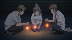 So how does Sakuta help resolve all this? For the most part, by just being a friend. For much of the episode, he checks up on both Futabas and helps each one accept that they are all part of the same person. A couple of moments do stand out. I particularly love how Sakuta promptly gets Futaba (the one with the ponytail) out of a pinch when the latter gets harassed online and sets up two fireworks-themed hangouts with two of them and Kunimi. But all things considered, the resolution is pretty modest, certainly compared to when Sakuta had to scream to an entire school about how much he loves Mai or when he had to tolerate Tomoe’s time looping shenanigans. And I think such modesty is worth noting. It feels very true to life, how oftentimes you just need a great friend to help you remember you’re fine just the way you are. Sure, chances are that you haven’t been literally split apart into two clones by your inner turmoil but the message still stands.