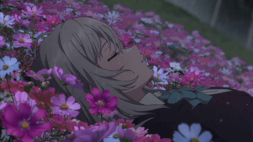 Obviously, the gang manage to find Hitomi. The one reassuring thing is that if Hitomi comes back, it’ll be at the same spot. Even so, I find the image of Hitomi resting on the bed of flowers nearby so ominous. She looks like she’s dead and given what’s stake, she might as well be if things go south. One very subtle detail that I love is the little train droplet that trickles down her hair and then her eyes. As it falls down from her eyes, it makes it look she’s shedding a tear which could denote how Hitomi feels. After all, she wants to stay in the present. She doesn’t want to go back to her time and leave behind all the friends she’s made.