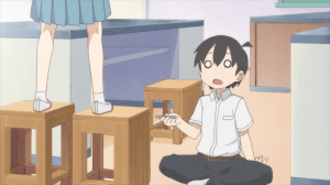 Mileage might vary here. Maybe you’ll laugh at the absurdities, maybe you’ll be turned off by them immediately. Comedy is subjective after all. Me personally, I just find Miss Ueno‘s execution to be one-note. Ueno incorporates some rather kinky stuff and hijinks ensues but that’s really kind of it. I suppose the potential lies more in Tanaka’s dense personality reacting to all this but I haven’t found it terribly effective. He reacts at Ueno’s filtered pee with disgust and refusal but it doesn’t really elicit a laugh as his attitude doesn’t directly stem to him being dense. I’m pretty sure plenty, if not most people, are generally not interested in drinking their friend’s piss. Then there’s the whole skirt skit. Him nonchalantly recording “data” for the experiment and not caring if Ueno is wearing panties or not is kind of funny. But after that, he does want to know what’s underneath her skirt and turns off her device as, apparently, he doesn’t know what kind of private parts girls have. One, this scene could come across as rather uncomfortable for some. And two, Tanaka seriously hasn’t gone to sex ed class? At that point, the joke is trying too hard.