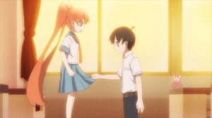 Onto the anime itself. True to the title, the titular protagonist, Ueno (Yuu Serizawa), is clumsy in how she she struggles to admit her crush to her incredibly dense classmate, Tanaka (Aimi Tanaka). That’s a fine hook and all but evidently, the creator of this story somehow thought it’d be better to perv it the hell up. Right at the start of the premiere, Ueno claims that she’s filtered her urine into clear water (I say “claim” because I don’t think filters work like that) and tries to make Tanaka drink it. Then she uses some sort of projector to conceal the interior of her skirt and makes Tanaka participate in an experiment where she flashes him. Oh, I should probably mention that these characters are all middle schoolers…so there’s that too.