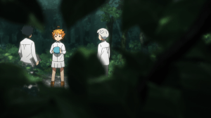 There’s also the matter of there apparently being a spy in the orphanage. Right now, all the signs are pointing towards Gilda, that green-haired girl with glasses with a lot of conspicuous shots of her looking at Emma with concern or suspicion. That she really wants to know what happened to Conny raises some alarms too. It’s possible that she is just a red herring and the spy is someone else though if that is the case, you’d think there’d be foreshadowing involving multiple suspects and not just one. Frankly, the best hint at the existence of a spy was during one of the trio’s conversations with the “camera” situated behind the bushes. Not only does it make you assume they’re being watched but it also obscures the identity of the observer. Had Neverland just stuck with that scene, I think the show could’ve sold Emma’s paranoia at the end of the episode even more.