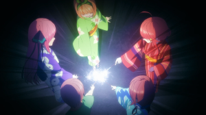 The reunion scene where the sisters make do with some senko hanabi at a playground is simply pleasant. It’s especially reassuring to know that everyone accept Ichika’s need to bail for what it is and resolve to brave whatever hardships the future has for them as a family. Some of the others are even willing to admit that they all played a part in messing up their festival plans too. Also, any scene where Nino is able to come across as somewhat likable gets my seal of approval.