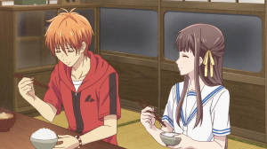 This change causes Episode 2 to be split into two distinguishable parts. Part A develops Tohru’s relationship with Yuki and Part B develops hers with Kyo. Both boys are characterized equally and that’s something that ought to be stressed given their importance in Fruits Basket‘s story. You even get a great parallel with the impression Tohru is laving on Yuki and Kyo. Yuki is amazed how Tohru accepts his secret for what it is. Kyo is stunned that Tohru appreciates the rejected Cat zodiac. The context is slightly different but both scenes involve Tohru not only accepting attributes Yuki and Kyo are ashamed of but also telling each boy that she wants to be their friend.