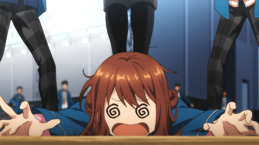 As for the characters…what characters? Frankly, the one who stood out to me was the one girl in the cast, Anzu (Maaya Sakamoto). How and why a girl is transferring to an all boys school is beyond me but I’m more astounded at how much of a self-insert Anzu is for the viewer. She is such a blank state that she barely speaks any lines of dialogue and so far, the most involved she gets in the plot is getting squashed by one of the idols competing in this episode. The four main idols start to talk about how she’s their inspiration and the key to the rebellion which is laughable as the show expects you to supplant your own charisma into her character. Maybe in the mobile game that works but here, you’re expecting far too much from the viewer.
