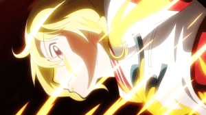 For a second, I thought the show did something interesting when Rena got trapped in the not-witch’s illusion and was sulking in front of a TV, watching an idol. I figured that the idol was supposed to be Kaede and Rena was literally idolizing her. That’d be on the nose but it’d at least be something. But no, I double checked and that idol is some other character (who’s maybe important since she has her own page on the Madoka wiki). The show couldn’t even do something so obvious. I honestly think more was done with Rena’s relationship with Momoko as it’s implied that her shapeshifting to the latter is a subconscious habit. Perhaps, deep down, Rena wishes she has Momoko’s more sociable attributes. I kind of wish was more was explored there. Momoko doesn’t have much to do in this episode apart from hitting things really hard.