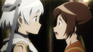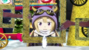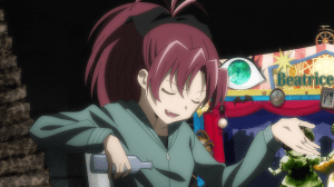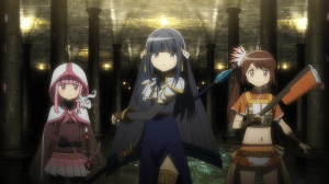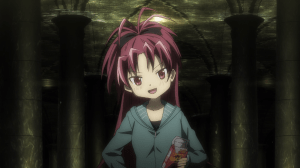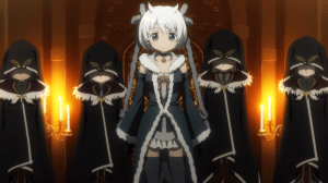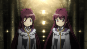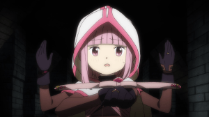Since Felicia and Kyoko are a no-go, I suppose that’s why we have Mifuyu showing up at the end. I wouldn’t have minded if her fate was left a mystery and Yachiyo was chasing a dead end but given what we know, it’s a logical development that she has joined the Magius. The real issue is trying to maintain ominousness with this character. We’re already predisposed to find Mifuyu off kilter after the Seance Shrine and why she can’t come back to Yachiyo and Tsuruno might as well have been summed up with a shrug. Still, I am curious to see how this will affect Yachiyo. We see her threaten to stop Mifufyu with force but given how distressed she was over killing a fake one, you have to wonder if she actually can muster the resolve to attack the real deal.