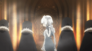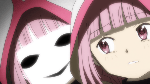 I realize I haven’t talked much about Felicia and that’s honestly because this episode surprisingly and sadly doesn’t do anything fancy with her. You do get a flashback about her past but it reveals nothing you couldn’t already infer from last episode. The most curious thing about it is the glitch-like graphical effects which is similar to the effects use to convey Iroha’s memory problems. Maybe Felicia’s memory has also been tampered but in what way and why it is tampered is something that’s apparently being saved for later (like everything else in this show). In the present, you have Felicia backing out of her cult membership as expected though her coming to Iroha’s aid gets overshadowed by her simply trying to kill every last one of those witches. The inner conflict works a little better at the end when Felicia decides to be alone again, afraid that her bloodlust will harm those she care about while also struggling to agree on giving that vendetta up. While Iroha realizes she can’t invalidate those feelings, she still insists that the two of them are friends who should stay together.
