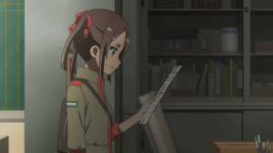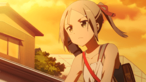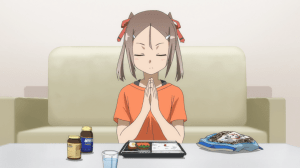 “My favorite part in the episode is whenever it cuts to Karin’s daily life. It effectively portrays how her life is changing because of the Hero Club. The first day has her following her training regiment to the letter, eating dinner alone, and reporting to the Taisha. On the following day however, she smiles a bit more and brings origami materials to practice on for the club event.”