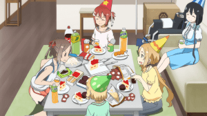 My favorite part in the episode is whenever it cuts to Karin’s daily life. It effectively portrays how her life is changing because of the Hero Club. The first day has her following her training regiment to the letter, eating dinner alone, and reporting to the Taisha. On the following day however, she smiles a bit more and brings origami materials to practice on for the club event. The third day is where the birthday party happens and its conclusion completely contrasts the first night. Karin enjoys cake and snacks with her new friends and she later joins the group chat, engaging in a more informal conversation.