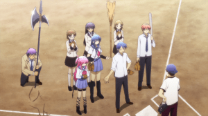 The backstory creates some suspension for the end of the episode. Once he learns of his friend’s past, Otonashi fears Hinata will disappear during the final game and that fear is exacerbated when Hinata is confronted with a pop fly similar to the one he failed to catch when he was alive. For a brief moment, it really seems like Hinata will disappear the moment he catches it is. Whether or not that is the case we’ll never know since Yui ultimately tackles him to the ground as revenge for all the times he’s attacked her this episode. It’s definitely convenient that she pulls a sneak attack at this very moment though I don’t mind it. Considering Iwasawa’s exist last episode, it’d start to feel predictable having characters repeatedly disappear by flashback. Plus, the show has more in store for Hinata and I’m glad it does.