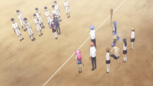 The plot of the episode is Yuri having everyone illegally compete in the school’s baseball tournament. It’s really silly, even by the SSS’s standards. I suppose Yuri just wants to a win of some kind against Tenshi so if it must be baseball, so be it. And the illegality of the SSS’s participation does get Tenshi’s attention, the girl bringing a team comprised of school regulars to the tournament and beating the SSS teams with Hinata’s as the last one standing.