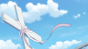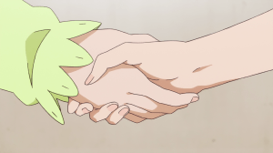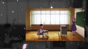 There’s some imagery that I want to bring up. First, there’s a group shots of Yuki and Miki’s eyes where the image of the other person is transposed over their pupil. That partially hints towards Megu-nee being a hallucination, as in Miki’s eyes only see Yuki. I think it also serves to show their budding friendship; they each recognize that they have a new friend in their life. Another image comes when Miki asks Yuuri to become a permanent member of the club (which is frankly a little silly; I doubt there’s trial periods going on). Yuuri offers a handshake which not only represents the end of hostilities between her and Miki but also parallel when Kei lets go of Miki’s hand as they part ways. That gesture seems to mean a lot for Miki as one of her drawings for the graduation album ends up being one of her and Kei holding hands. Having effectively lost a friend, Miki must take getting a new one very seriously.
