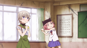 Eventually, Yuuri and Kurumi fill Miki in on Yuki’s condition. Yuuri also asks Miki to play along with it which the latter initially objects to. Yuuri’s response back is fascinating. School-Live! has had the girl act scary for laughs but this is the first time where her intimidation feels 100% genuine. Miki argues Yuki won’t get better and Yuuri responds with “‘Better, huh? What would get better, really?'”, smiling in the process while her eyes open up halfway. As the conversation escalates, her fists clenches and her body shakes. She looks about ready to punch Miki and she probably would’ve had Kurumi not intervene. When Yuuri tells Miki that she doesn’t understand the situation, I get the impression that she’s asking her if she thinks club hasn’t tried to help Yuki already. They’ve must have at this point and chances are they failed and almost made things worse. I’m assuming that Yuuri looks and acts the way she does in this scene because she feels defeated about the situation. She wants to help Yuki but can’t and she’s forced to accept things the way they are.
