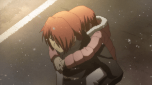 Hatsune’s role is brief and her dying is predictable but in spite of all that, I think the show manages to convey how much she means to Otonashi in such a small span of time. You see Otonashi saving up and giving his sister gifts and even as it becomes apparent that Hatsune’s condition is worsening, Otonashi still keeps his promise to fulfill her wish to see the Christmas lights. The Christmas scene itself is one of my favorite images in Angel Beats!. The bright, colorful holiday lights belies the tragic tone of the scene and even as Hatsune succumbs to her condition, she still clings onto the thing she’s most thankful for: her brother.