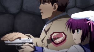 Like with Episode 2, the roster whittles down to Otonashi and Yuri. The context for them being the last ones is pretty different though. In Episode 2, it’s them simply because it’s the newbie and the veteran leader. Here, it’s more personal this time around. Otonashi being one of the last two makes sense as he is Kanade’s friend. As Hinata and Yuri points out, if Kanade is waiting for anyone to save her, it’d be Otonashi. Meanwhile, having Yuri survive up to this point allows us to see one more fight between her and Kanade. In fact, this is actually the first and only time Yuri manages to beat her longtime rival. She anticipates the clone to use “Howling”, a new and extremely deadly Guard Skill, and uses that opening to win. It goes to show that while Kanade is far more powerful, Yuri can outsmart her (though I do doubt that the original Kanade would use a move that leaves her so open). Having the opponent be a clone also allows Yuri to fulfill her goal without jeopardizing her gradually changing opinion of the original.