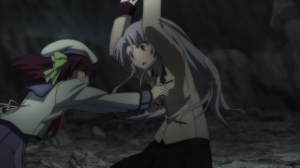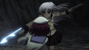 As it turns out, when Kanade saved the SSS from the giant fish (writing that down will always feel weird), she used a Guard Skill called “Harmonics”. This allows her to replicate herself. The downside becomes apparent as the clone still exists and acts on her own accord. Most notably, she’s extremely hostile towards the SSS and even her original persona, her personality stemming from the original’s brief desire to fight aggressively at the time. Otonashi comes to Kanade’s defense here, stressing that the clone’s personality was not her intent. Nevertheless, everyone agrees that they’d rather not have another Tenshi to fight. Yuri, with her “amazing” computer skills, manages to program in a new skill that forces the clones to reintegrate into the original. However, everyone soon discovers that the clone has taken the original hostage in the old Guild and copied herself right before the new skill is programmed in.