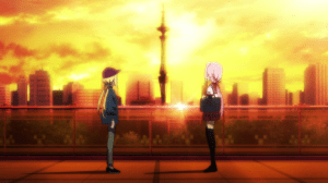 I do kind of like the little moments between Iroha and the others though. Tsurono offers to cook lunch for Iroha gets her to eat more of her 5/10 cooking (she also hires Felicia as a waitress in Banbanzai which is downright hilarious). The scene where Iroha retrieves Felicia from the police station is really nice. It’s sweet of Felicia that she considers Iroha the closest she has to family and Iroha very much honors that bond when she neither expresses annoyance that Felicia got arrested nor does she question about it, much like how an understanding parent would. Yachiyo has one peculiar scene where she’s calling an ally about the rumors and the Wings and as soon as she realizes Iroha has entered the room, she hangs up. Perhaps she’s concerned and doesn’t want Iroha involved? Whatever the motivation, this episode makes it clear that Yachiyo still cares about Iroha. During the climax where Iroha fights solo, Yachiyo gathers the others and rushes to her aid. After fighting, she’s relieved to have made it in time.