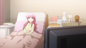 Maybe this is just me but I found Yui’s backstory to be handled differently from the others’. For one, you’re not shown the car accident that paralyzed Yui or learn how she actually died. Instead, you just get a prolonged scene of her in bed while her mother takes care of her and she watches television. It’s far less dramatic compared to how other flashbacks in the series have been presented and I find that to be a strength. The more tranquil tone befits Yui’s ennui, having to stay in her room indefinitely and not be able to do things she wants if she could freely move. Her bucket list of regrets are way more absurd than anyone else’s but there’s a cute innocence to it all. She aspired to be a singer and compete in various sports as those professions comprised much of her what she saw on television and those are all things she wished she could do if she somehow recovered.