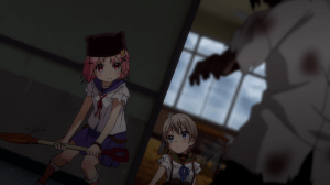 We’re now left with Taromaru to worry about. You do see him run off (I guess even as a zombie, he runs away from Miki) but the cameo is curiously all the screen time he gets in this episode. That can only mean he’ll show up again for the finale. I’m actually expecting Yuki being the one to kill Taromaru. It’d be a reversal of Miki killing Megu-nee, each friend ending up putting the one that means most to the other out of their misery. That said, Yuuri or even Kurumi doing the dirty deed is entirely possible.