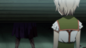 My gut tells me Kurumi is going to live but this show sure is doing a good job making me feel unsure. There’s now a blanket put over her body and while that looks a little silly, obscuring what’s happening to her does heighten the tension. You’re forced to imagine the infection spreading more across her body and you can’t tell if there’s still hope for her yet or if it’s too late. In addition to that, you have Yuuri contemplating if she should put her friend out of her misery. She does muster the resolve and readies her knife but later in the episode, you see her trembling and stopping at the very last second. If not the anime, I hope the manga explores this scene further. Kurumi entrusted Yuuri to kill her should she get infected and her friend ultimately fails in this task. Assuming these two both survive, I can see Kurumi being a little upset about this and Yuuri realizing that she’s not as iron willed as she maybe liked to believe.