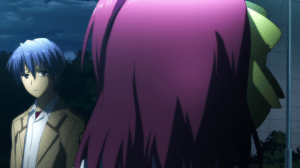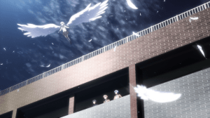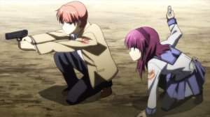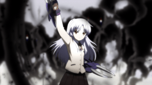 To be honest, I consider the stuff with the Shadows the weakest part of Angel Beats‘ story. The reason is that it is so blatantly set up as the endgame. Like, Jun Maeda or someone else in the staff realize that there’s only three episodes left and they need to wrap things up so they came up with monsters that threaten the SSS’s way of “life”. It’s also possible they just wanted to end on something flashier. Character development? Screw that, let’s just show characters hitting stuff some more. How else are we going to show off Kanade’s new wings?