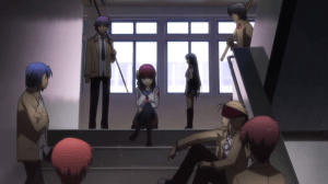 The climax of the episode does incorporate Otonashi and Kanade’s goal in some way. Yuri gathers the SSS and reveals that she has caught onto what the two were up to (she does seem smart enough to figure it out) and asks Otonashi to advocate for moving on as it’s everyone’s best chance at surviving the Shadows. I suppose it’s a decent comprise but the scene doesn’t really strike that emotionally. Hinata and Naoi backing Otonashi would matter more if Otonashi got to do more with his plan. The most vocal objections actually come from the extras which doesn’t matter since they’re extras. All the named characters just listen and they’re even shoved into the background of the scene. Most importantly, I don’t know how I feel about the way everyone is getting encouraged to move on. It remains a choice but in this case, it’s more about risking to become an NPC than reconciling with your regrets in life. By having characters decide so freely and necessarily, you undermine whatever it was that held them in this world. Not to mention, this move is clearly done so the staff don’t have to develop anyone’s character further.