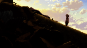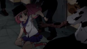 I think my favorite part in this entire episode is how mature Yuki now seems to be. Part of that is visual. At the beginning of the episode, one of the zombies rips off one of the wings on Yuki’s backpack. I don’t know if I mentioned it before but I’ve always thought the backpack was meant to make Yuki look angelic, denoting her innocence, however real or fabricated it is. With one of the wings removed, I interpret that as saying Yuki is a fallen angel of sorts since she’s no longer in the “heaven” she created for herself. Another change is the fact that Yuki no longer wears her hat, having decided to leave it buried alongside Taromaru. I’ll admit, the symbolism behind it eludes me. Maybe the black color and the cat-like appearance is meant to say Yuki is like a black cat, a symbol of misfortune (which is maybe ironic given how she’s helped her friends)? What I do know is that Yuki does look way less childish without her hat. She looks more her age now.