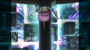 Despite being an Uwasa, Ai is not the least bit malicious. In fact, the reason she contacts Iroha is because she wants the magical girl to destroy her. She explains that Sana has been her prisoner for some time and after spending time together, she’s grown to feel remorseful about the situation and has decided to let Sana be free. For that to happen, she needs someone to destroy her and look after Sana, hence her enlisting Iroha’s aid. I’m a little confused about the exact nature of Ai. That she’s both a supernatural monster and also a computer program doesn’t really add up to me. At the same time however, I like the idea of an Uwasa developing their own sense of self and a conscience. Not only does it better distinguish them from Witches, it’s refreshing to have our monster of the week as more a legitimate character and less a stylistic prop for the characters to beat up.
