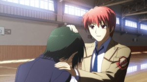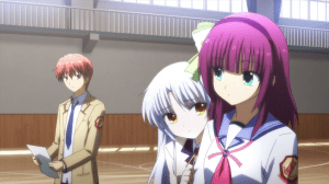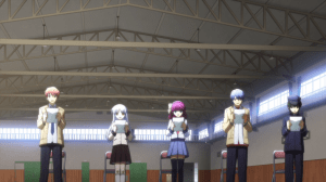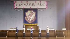 Besides that one hiccup, the graduation ceremony is a terrific scenario. Everyone is so at ease here, especially Yuri and Kanade. Everyone notes a change in behavior with Yuri now that she’s found peace with herself and is no longer leading the SSS, making the girl fluster at times. Kanade acts the most expressively she has in the entire series. It’s implied she never got to graduate, be it in real life or the afterlife, and you can easily tell how happy she is about to finally experience it. She’s skipping towards the gymnasium (humming “My Song” along the way; a very nice touch) and she smiles throughout the whole event. There’s also some really fun banter between the characters. My favorite bit is when everyone sings a school anthem written by Kanade, realizing along the way that the lyrics are all about mapo tofu (because of course it is). Hinata gets on her case and Kanade cowers behind Yuri for emotional support despite being the most powerful out of the five in the room. It’s so darn cute.