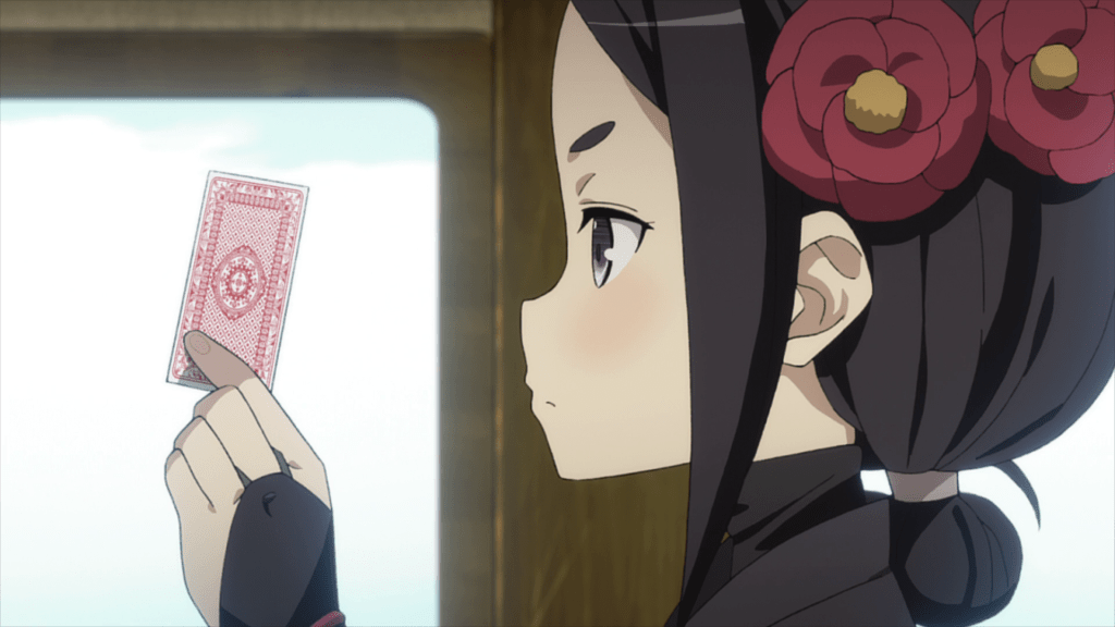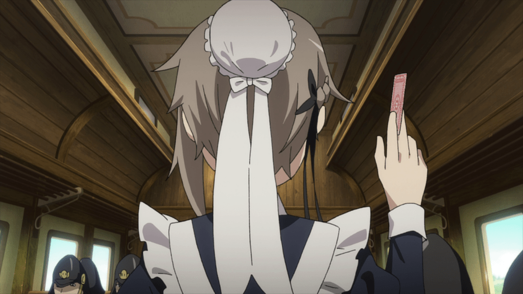 In the following scene, you have Ange and Chise patrolling the train and passing by soldiers playing poker. Chise keeps grabbing a random card from someone, presumably curious of the foreign game, and Ange keeps confiscating the card and putting it in some other person’s hand. It’s certainly a funny scene, especially with the soldiers’ reaction to the girls’ shenanigans, though it’s peculiarly put together. In a sense, Ange and Chise are playing a game with each other, trying to decide if they can trust each other and if any of the information they’re imparting with each other is truthful or not. Chise grabbing random cards serves as a metaphor; it doesn’t matter what persona information she imparts or rather, what hand she has. Ange still doesn’t trust her.