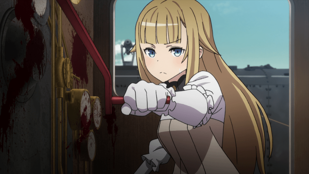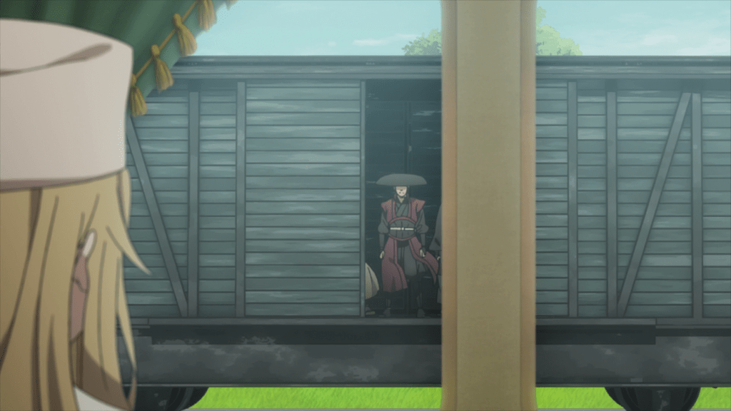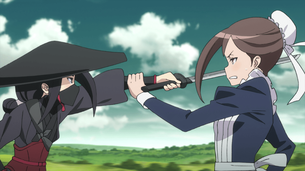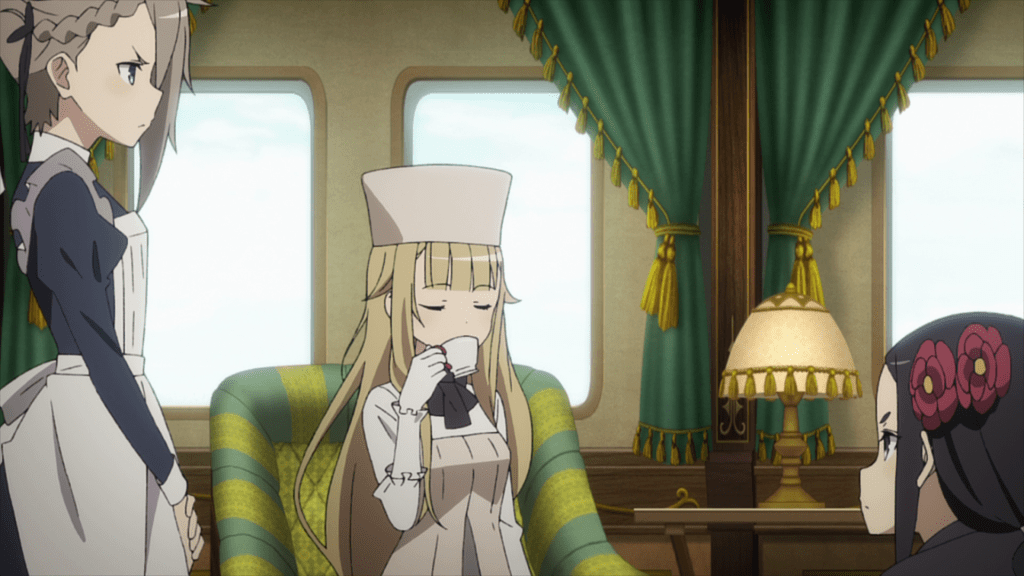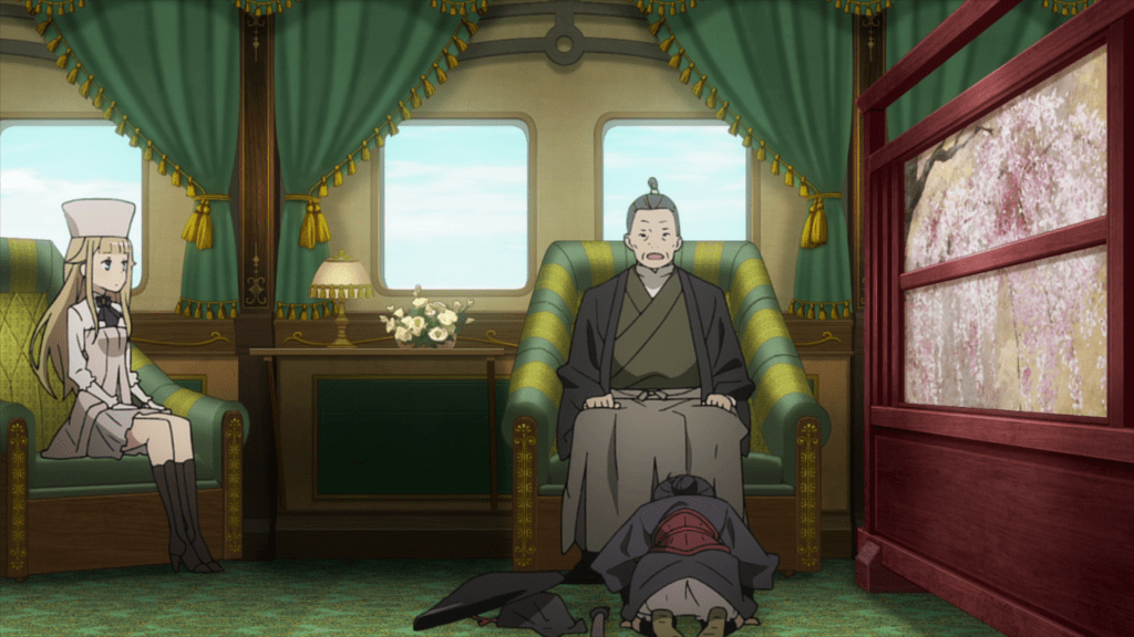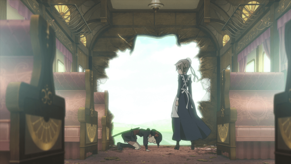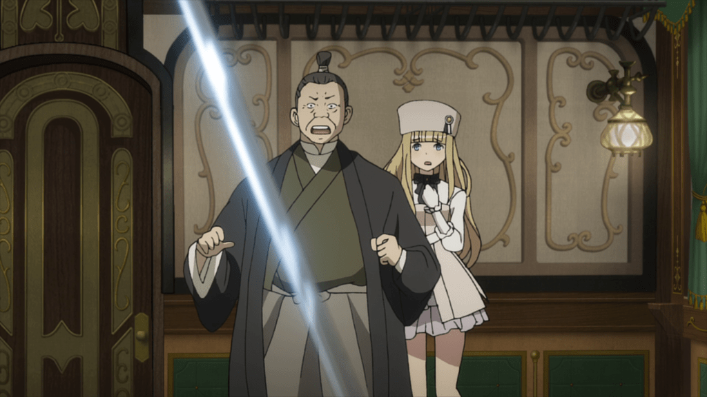 The fifth episode begins with Lord Horikawa arriving in Albion for a diplomatic meeting, meeting Princess and her friends at the dock. Chise isn’t actually part of Horikawa’s escort but has instead traveled to Albion and boarded the train of her own accord. She explains that she’s here for a chance to kill Jubei Todo, an assassin targeting Lord Horikawa and her father’s killer. Sure enough, Jubei shows up for the kill, having been tipped off by the Duke of Normandy (who hopes Princess will get caught in the ensuing carnage). Ange and Chise cooperate to stop Jubei from assassinating Lord Horikawa (and possibly Princess as well).