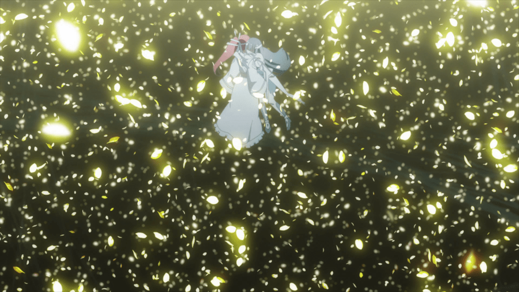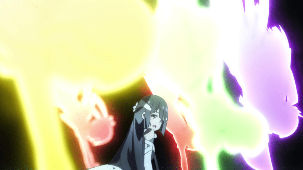 The final fight between Yuna and the wrath of the Gods is downright gorgeous. YuYuYu has always done well in those departments, especially with its soundtrack but my goodness, did the staff really outdone themselves here. So many shots just pop at you. The extreme wide shot of Yuna flying up towards the gods is this gorgeous mix of red, purple, yellow, and grey. The close ups of Yuna are meanwhile colored in monochrome. The list just goes on. And the music. What a terrific symphonic score we get to hear. If nothing else, this scene is a feast for the senses.