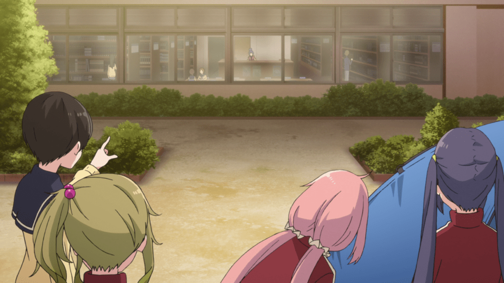Eventually, Nadeshiko and Rin bump into each other. The Outclub practice setting up a tent which Rin and Ena sees from the school library. When one of the poles snaps, Rin notes that the issue can be fixed with a fitter though she’s hesitant to go out and help the club, preferring to mind her own business. Ena ends up heading out instead though she does take the opportunity directing Nadeshiko’s attention to Rin, thereby allowing the two to reunite. This leads to one of my favorite gags in the series where Nadeshiko runs up to Rin, only to then crash into the glass window. The animation of her slowly sliding down the glass always cracks me up.