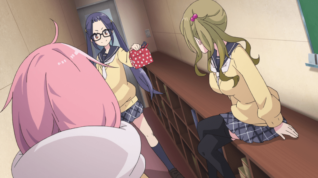 At first, Chiaki is on the fence about welcoming a third club member. Thing is, the clubroom (which, according to Aoi, was originally meant for storage) is extremely narrow and will only feel more cramped with more people. However, Aoi convinces her otherwise as having a third member means the club is just one member short of meeting the quota for a larger room. You then get the slight impression that Chiaki and Aoi are a little desperate to keep Nadeshiko in their club by keeping her engaged in spite of their lack of resources (more on that in a bit) though that soon dissipates as this is Nadeshiko we’re talking about. She’s so friendly and enthusiastic that it’s hard to imagine her giving up on the club so quickly.