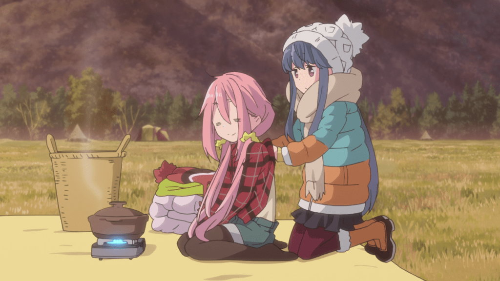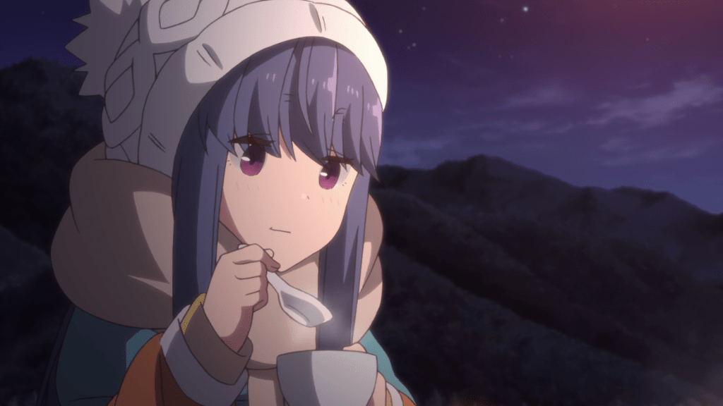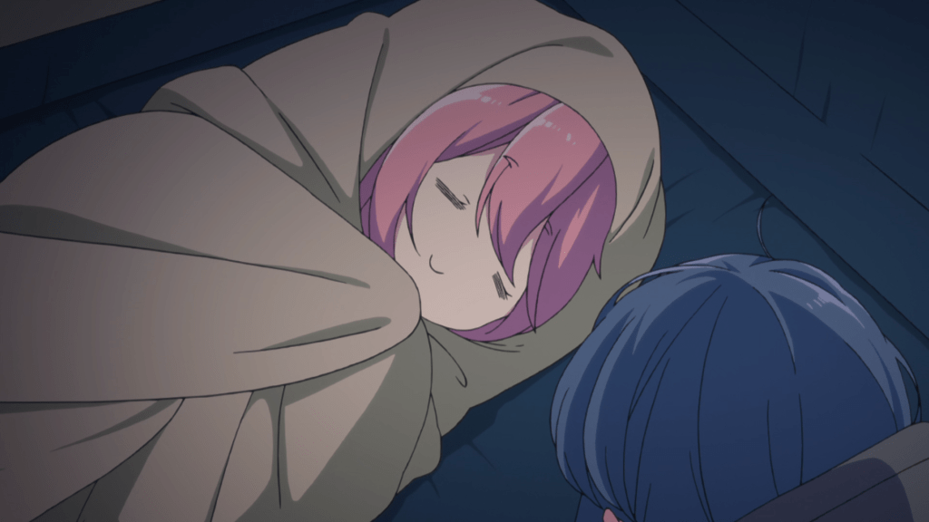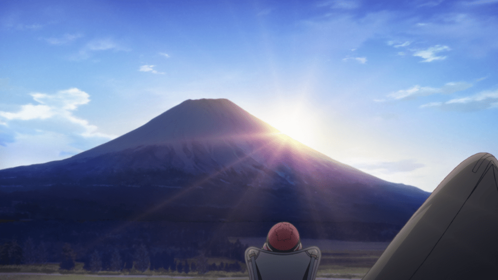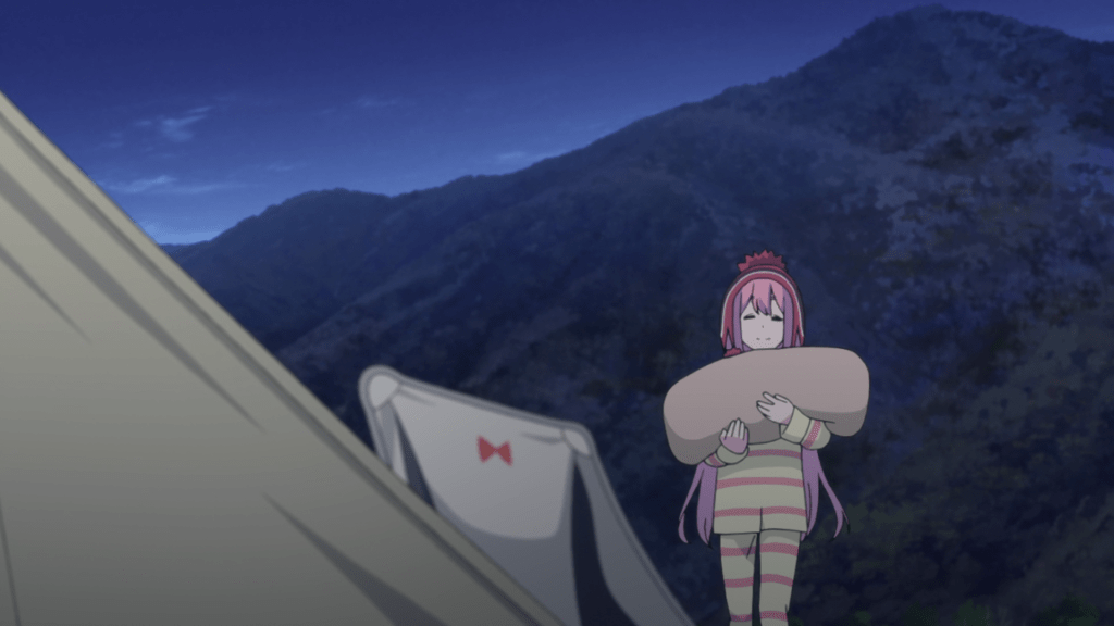 I love that there’s build up to the sunrise. You have Nadeshiko groggily walking back to Rin’s tent with a blanket in tow and the sky gradually getting brighter. Just as she turns to adjust her seat, the sun fully rises, giving both Nadeshiko and the viewer a stunning sight to behold. It’s further enhanced by the music, starting off quietly and gradually getting louder until it blasts you with its sound at just the right moment. The best part of the scene however is that after putting this much effort, Nadeshiko decides it’s too bright outside and goes inside Rin’s tent to sleep some more. It kills the mood so quickly but it’s also so realistic and within Nadeshiko’s character to do that I can’t help but find it funny.