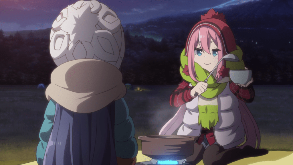 From there, the episode is squarely about Rin and now Nadeshiko spending the rest of the trip together. For dinner, Nadeshiko prepares a hotpot for the two of them. That’s certainly an upgrade from the cup ramen in the first episode and once more, you see how Nadeshiko’s presence and appetite is able to enhance the mood. You also have some fun banter that plays along the way. Rin offers some heat pads so that Nadeshiko can stay and the latter briefly hesitates to accept them, afraid Rin will ask for a price again as a joke (the episode even established she forgot to bring money again). When the food’s ready, Nadeshiko playfully acts like a supermarket employee handing free samples and then a grandmother serving food to her grandkids, much to Rin’s bewilderment. Between the food and the banter, Rin gets a sense of how much fun it can be to camp with a friend and have a change of pace to what she’s used to.