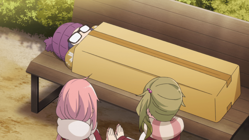 I’ve been throwing in comments about the characters’ wallets throughout these episode re-reviews as it really is a recurring gag throughout the show (and my personal favorite gag to boot). That said, no episode better exemplifies how stinking broke the Outclub is than this one. Camping equipment is pricey, that is true, but I still think it says something if these girls are still trying to cheap out on their gear. They have a sleeping bag meant for the summer and try to find use out of it in the winter season by adding materials that’ll insulate. It’s a cute scene, I especially like how Chiaki is the test dummy and Nadeshiko keeps running off and coming back with the materials, but I really have to wonder the exact budget if they’re trying to save even more. The best part is that while the makeshift sleeping bag actually works, you can’t get out so it’s deemed impractical and the girls end up biting the bullet by buying actual sleeping bags.