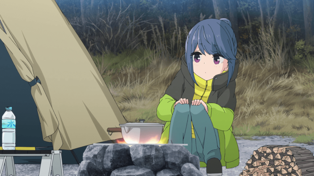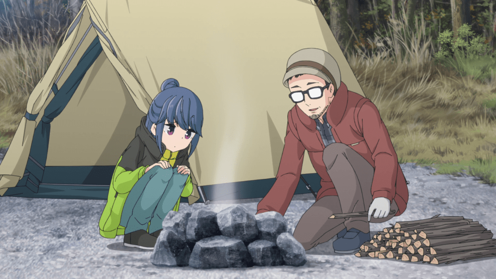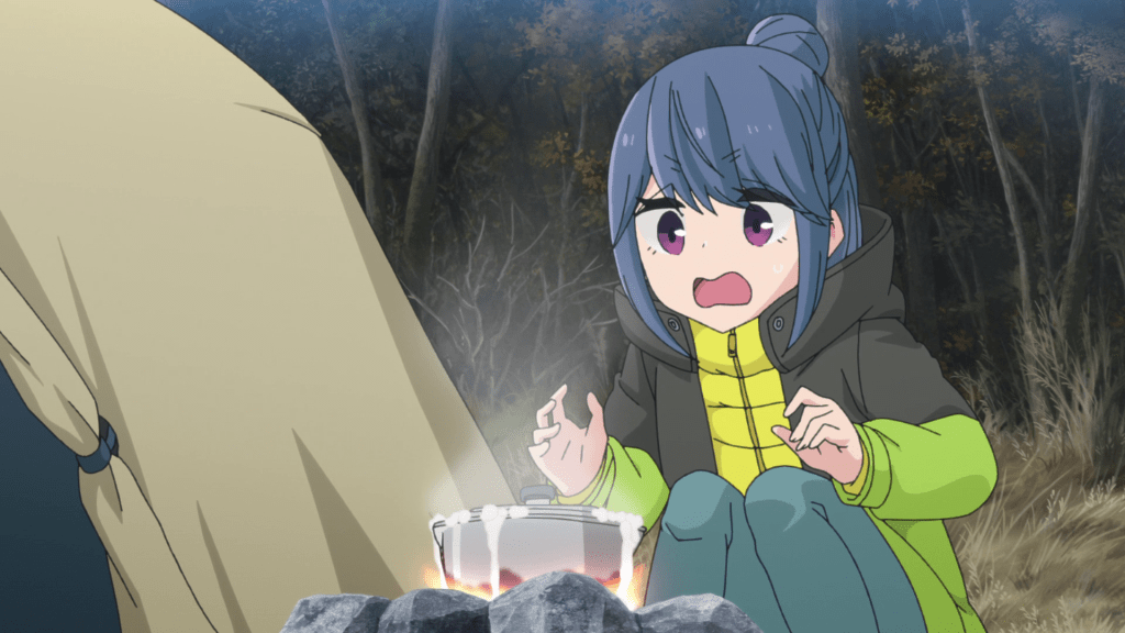 It’s a little weird seeing Rin camp this young and so inexperienced. Not that she doesn’t make mistakes in the present but usually when she does, it’s due to circumstances beyond her control or that she didn’t foresee. Here, you can really tell that she’s new to camping. She’s not as knowledgeable with how to make campfires and ultimately gets help from the man in charge of the campsite (and yes, that actually is the same minor character from the first episode of Season 1). Later, she tries to cook curry rice and not only does she fail at it, she also gets soot on her pot which is a rookie mistake she mentions in Season 1. Also, she’s camping with her grandfather’s hand-me-downs unlike in present day where all her gear is bought with her own money. Rin camping on a budget? I never thought I’d see that.