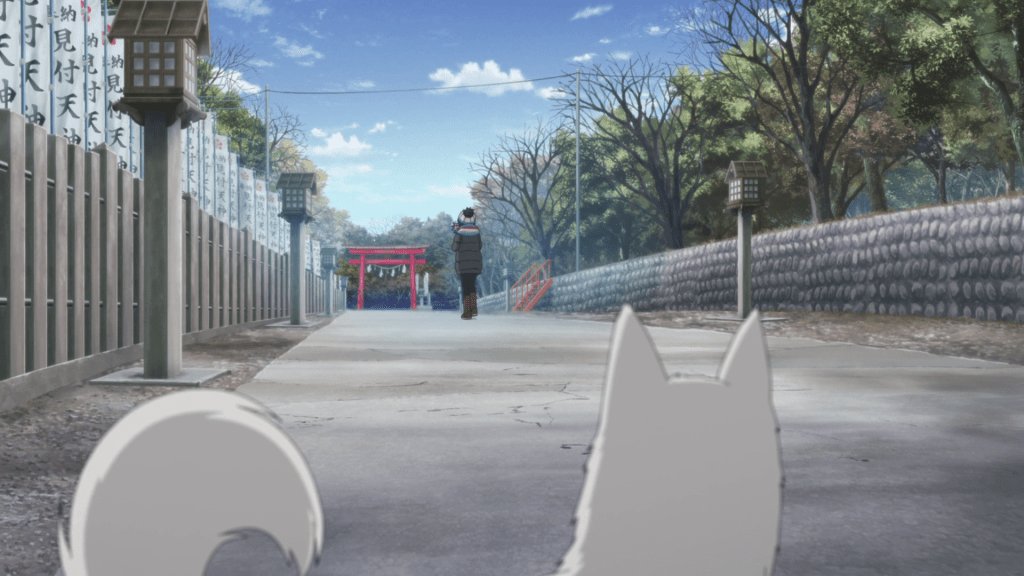 There’s a couple of pitstops Rin takes along the way. The first is a tea shop recommended to her by her mother, the owner of which is actually the mountain climber she met back in Season 1’s ninth episode. I’m just as surprised as Rin to see this character again. She did have more lines than your average extra but who expected she’d make another appearance? Nevertheless, it’s a neat little callback and exchange. Later on, Rin visits the shrine that sold her on taking this trip in the first place. Unfortunately, the dog she wanted to meet has passed away so Rin instead pays a visit to its grave and leaves with yet another doggie trinket. This later leads to Rin asking Ena over her concerns of Chikuwa eventually passing away. Ena gives a very honest answer, admitting that such a day will eventually come but that also gives her all the more reason to spend time with her pet. As surprising as it is to hear two characters of Laid-Back Camp to talk about death, the conversation is a really thoughtful one and it does play into the show’s theme of spending time with the people you’re close to. Moments such as this is what makes the show feel so grounded and earnest.