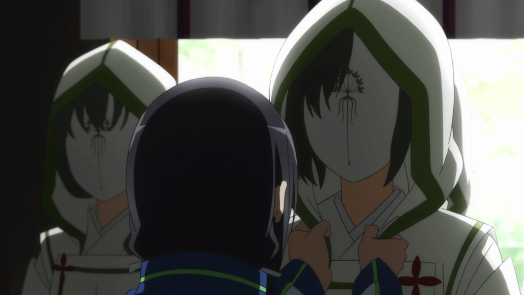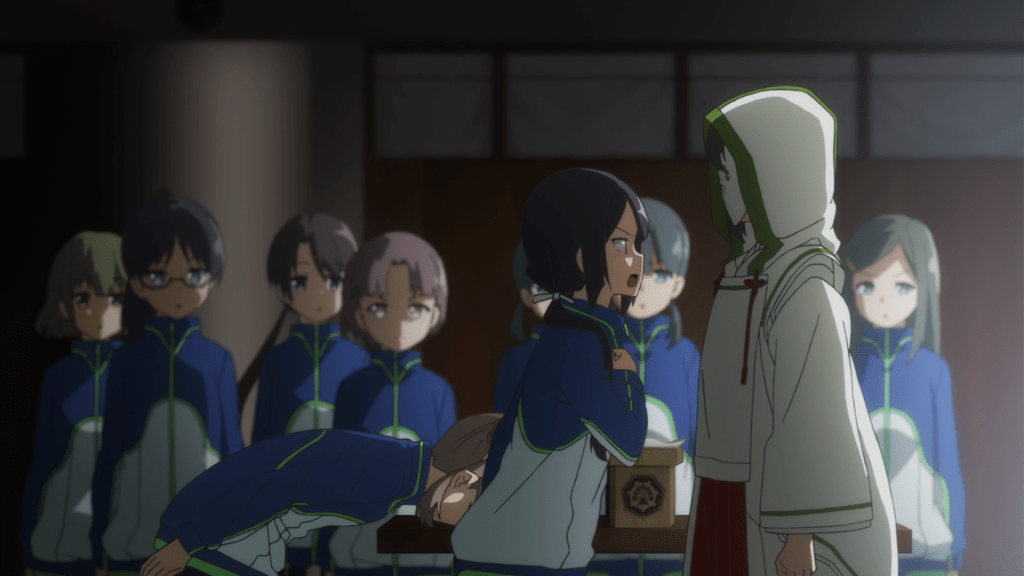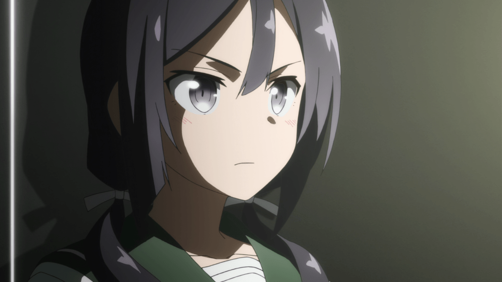 Following a repeat of the previous episode’s ending, this episode starts off by jumping back in time, taking place two years before the start of Season 1 and some time after The Washio Sumi Chapter. We see the Taisha gather dozens of young girls, all of whom are potential Hero candidates, training them until one “lucky” winner is selected to inherit the powers of a recently deceased Hero. Among the candidates are the ambitious Mebuki Kusunoki (Minami Tanaka), the conceited Yumiko Miroku (Naomi Oozora), and familiar face Karin Miyoshi. While not explicitly stated, it’s pretty obvious the Hero these candidates are training to replace Gin. Given the chronology, she’s the only one who fits the bill. Plus, all the candidates seen here are practicing at fighting with dual blades which were Gin’s weapons (although Gin’s were larger).