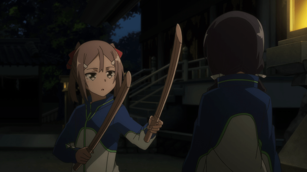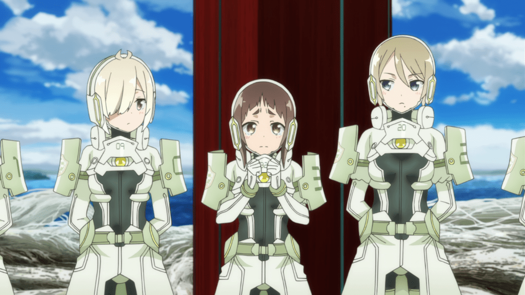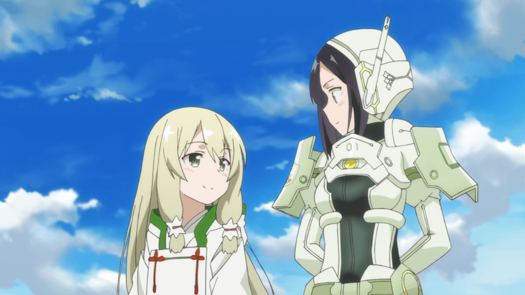 Some time after the Hero Club’s victory at the end of Season 1 and before the start of “The Hero Chapter”, the Taisha eventually finds a new use for all those failed candidates, including Mebuki, recruiting them all as “Sentinels”. Their task is to explore the realm beyond the barrier and plant a Divine Tree sapling in the hopes of restoring the world back to its original state. Mebuki appears to be assigned as the leader of the whole fleet and her own squad consists of Yumiko, a scaredy cat named Suzume Kagajou (Atsumi Tanezaki), and a quiet girl named Shizuku Yamabushi (Suzuka Ishigami). The fleet also appear to be aided by a Miko, Aya Kokudo (Yuuko Ono), who imbues the ships they’re using to travel with divine protections.